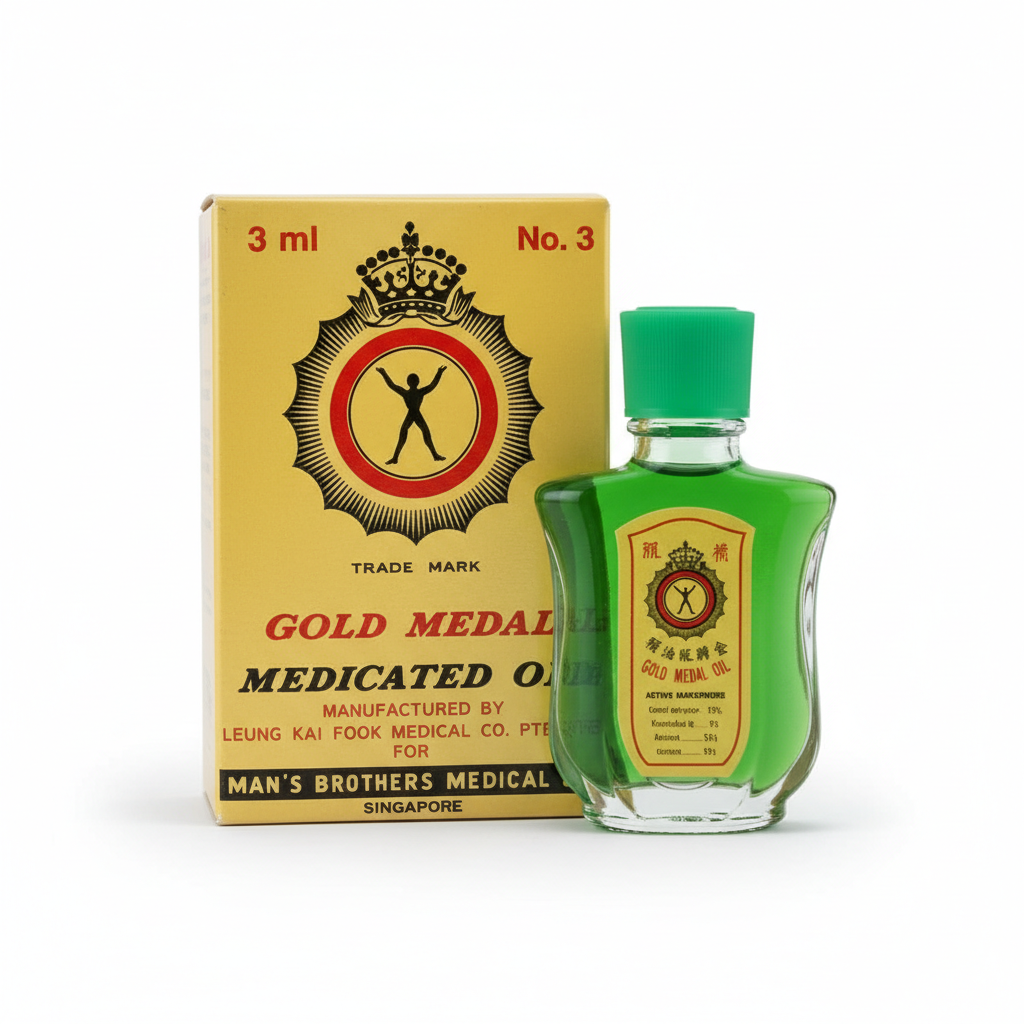 Discover the soothing relief of Gold Medal Oil, uniquely formulated to ease rheumatic pains, blocked noses, and stomach-aches. This medicated oil offers a refreshing scent that quickly alleviates discomfort, making it perfect for hot days and nasal congestion.